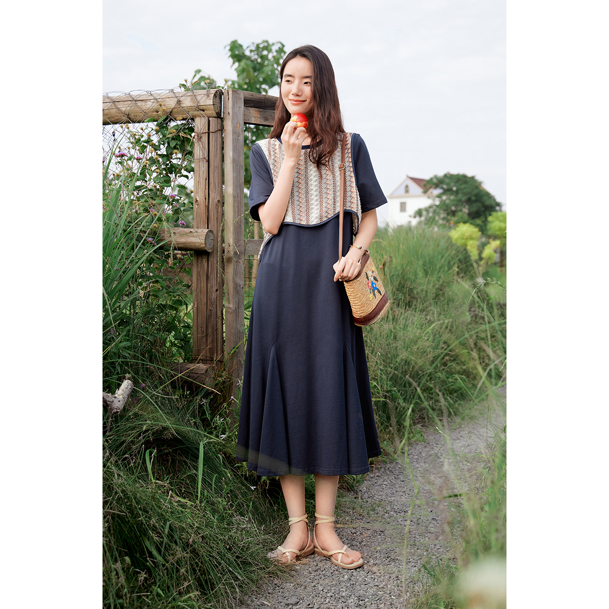 飞鸟和新酒假两件针织连衣裙女2025夏季新款轻薄透气圆领短袖裙
