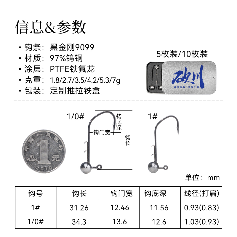 破川战锤钨头钩钨钢铅头钩鳜鱼专用翘嘴路亚大钩门鲈鱼微铅内德钩
