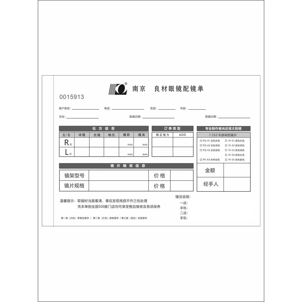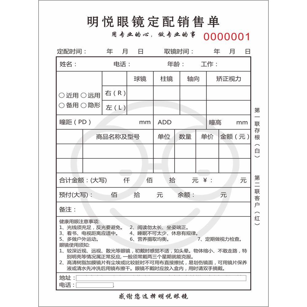 眼镜店验配购物单据定配销售配镜单验光处方单定制彩色三联单