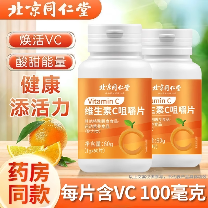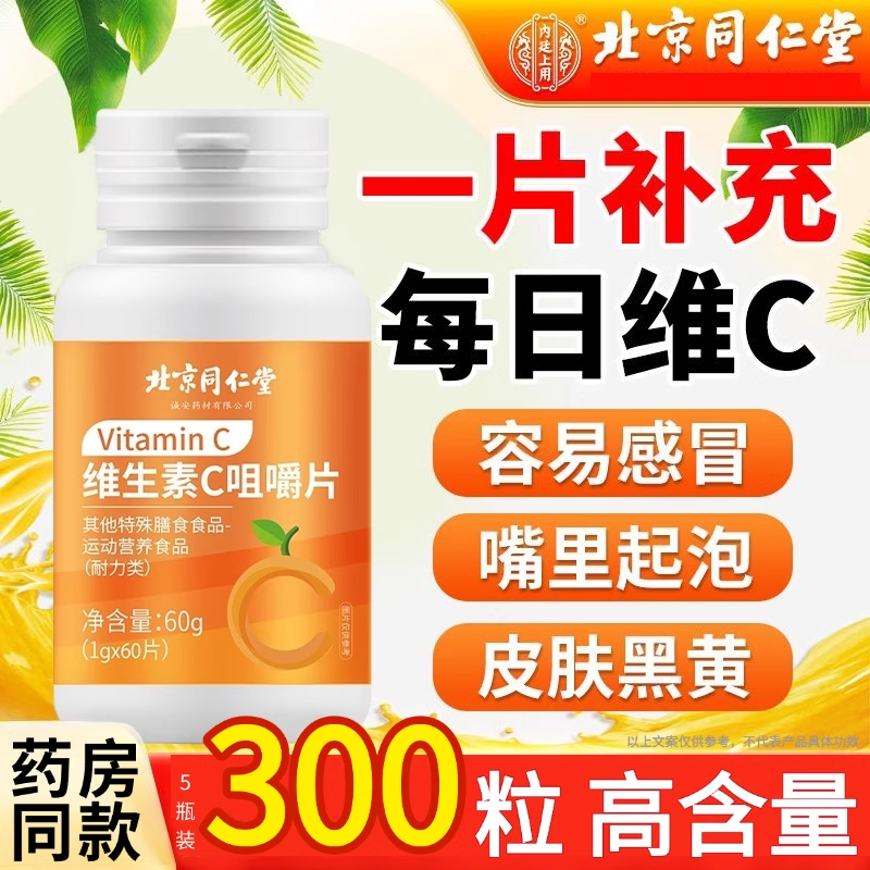 同仁堂VC片维生素c咀嚼片青少年增非强免疫力复合膳食维生素C瓶装