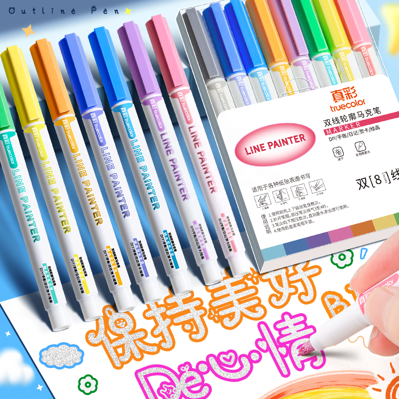 真彩双线轮廓笔24色闪光手抄报手帐专用神器双色荧光标记马克写字小学生儿童用划重点花型手账彩色曲线果冻笔