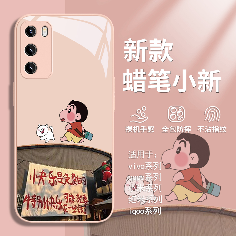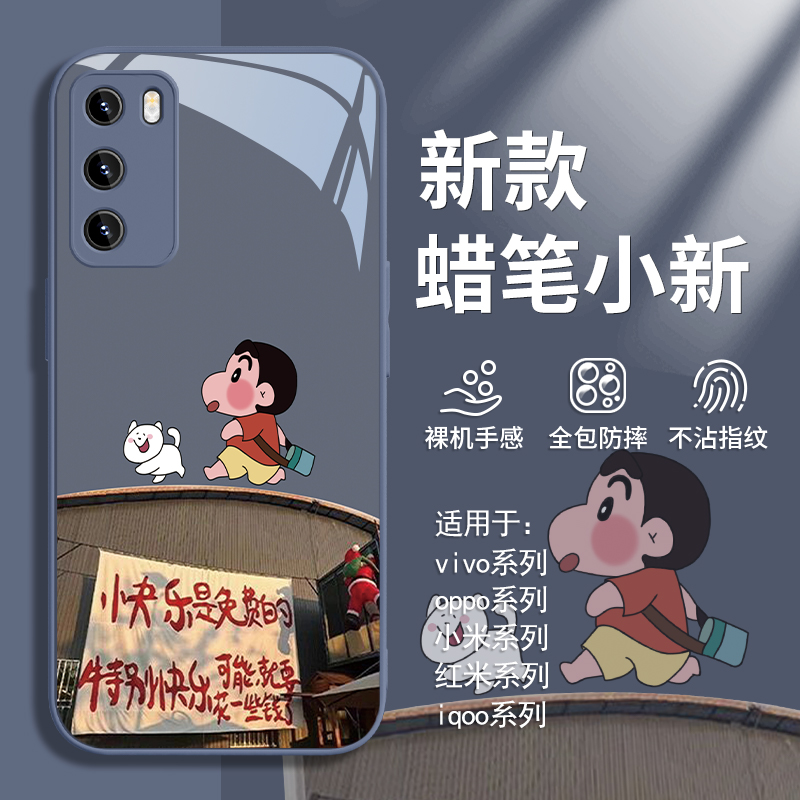 适用小米14蜡笔小新手机壳vivox100文字opporeno12简约iqoo12/11/10小白note13快乐是免费的neo9可爱k12玻璃