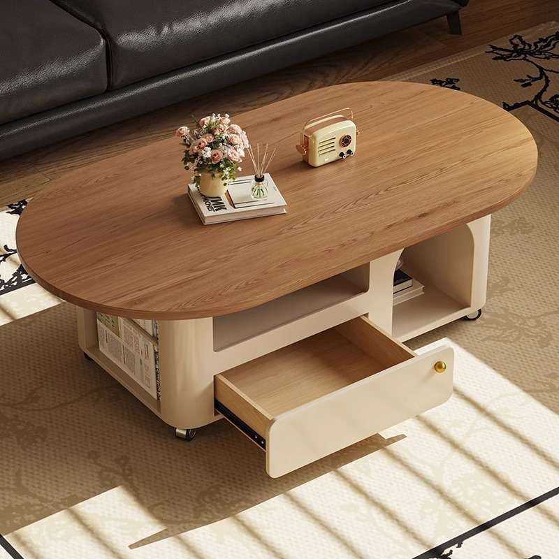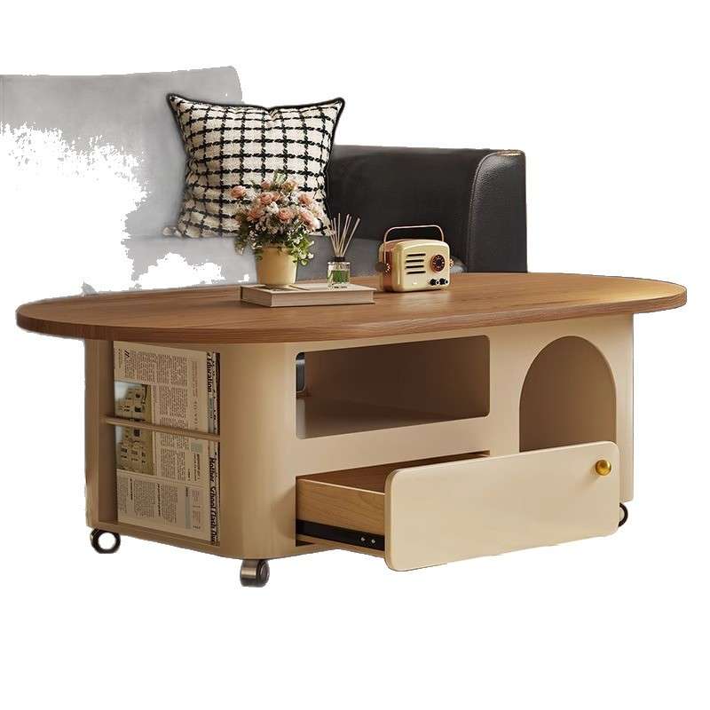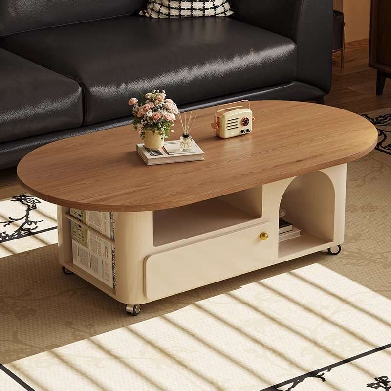 实木中古风茶几极简意式客厅家用设计师小户型高级椭圆形茶桌带轮