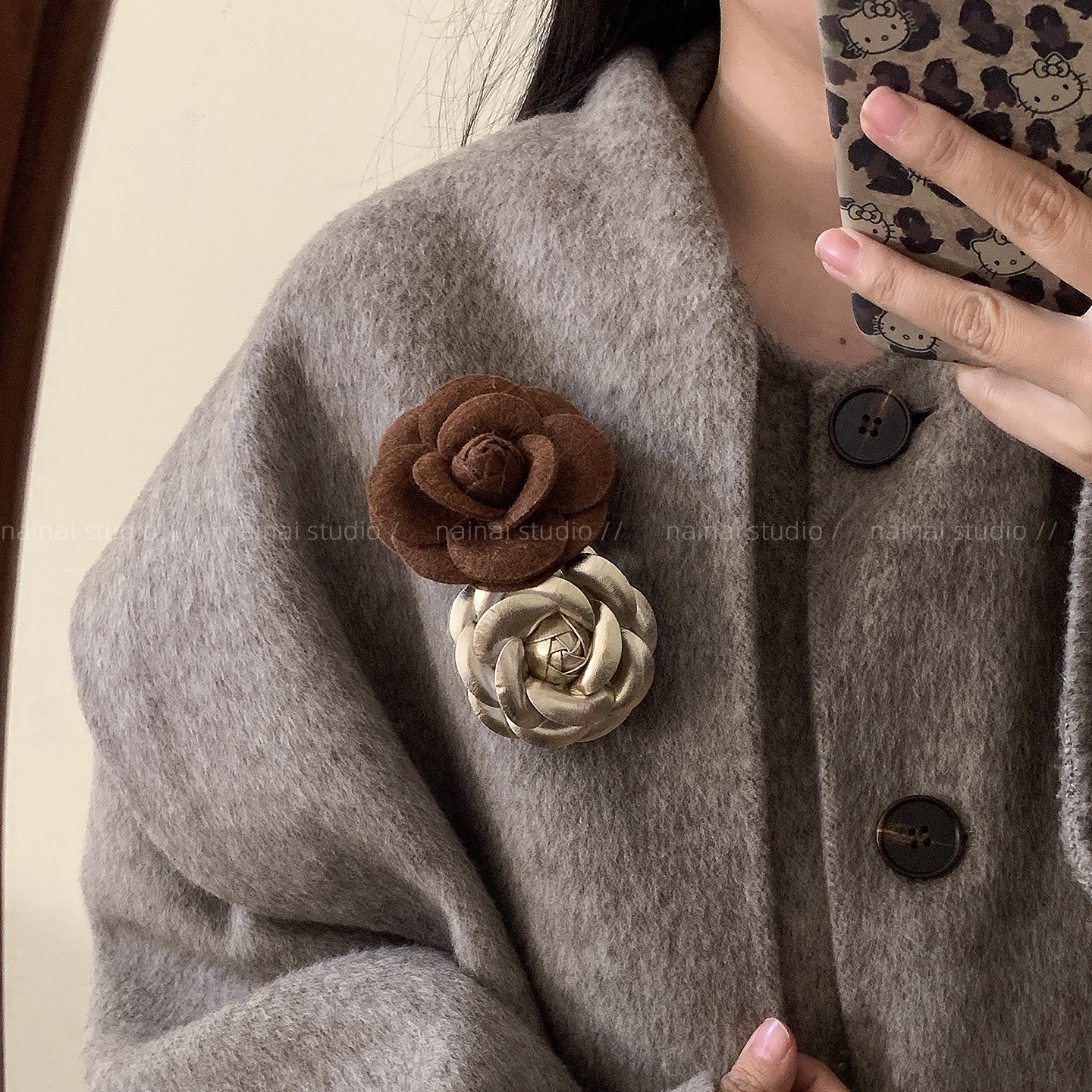 贵气千金~小香风山茶花胸针复古玫瑰花小众设计轻奢别针咖色配饰