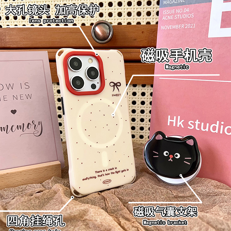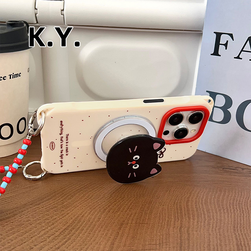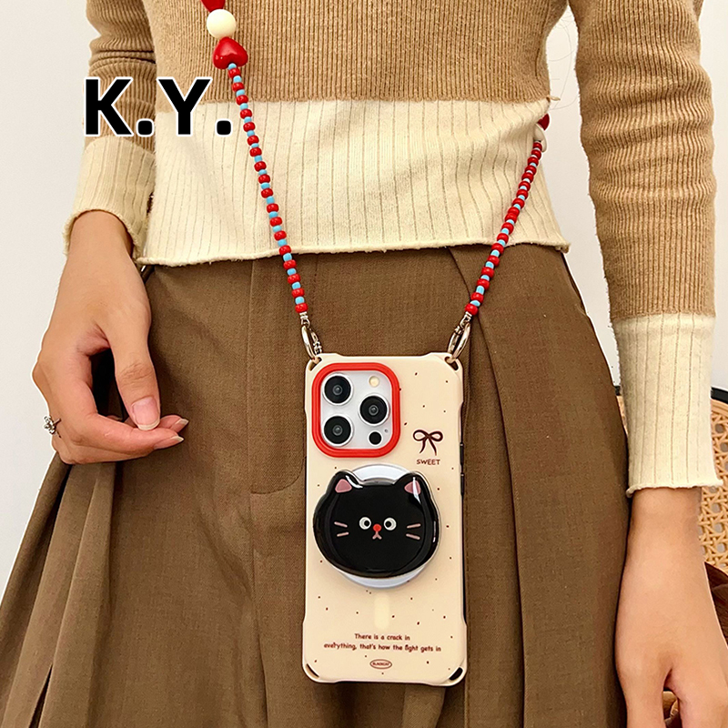 卡通红鼻子黑猫猫咪磁吸支架手机壳带挂绳适用于iPhone16pro华为mate60/70手提可斜挎背带findx8四角开孔14u