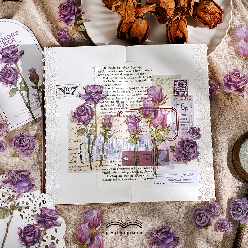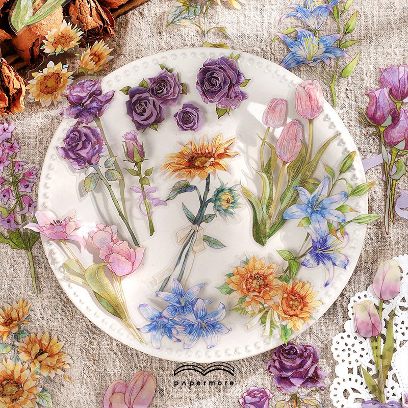 PET防水贴纸荒野余温大张和纸包植物花卉手账DIY装饰贴清新玫瑰向日葵花朵小尺寸素材材料包10张装防水贴纸