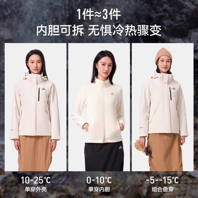 【山野新色】伯希和户外冲锋衣三合一可拆卸枚粉男女款防水登山服