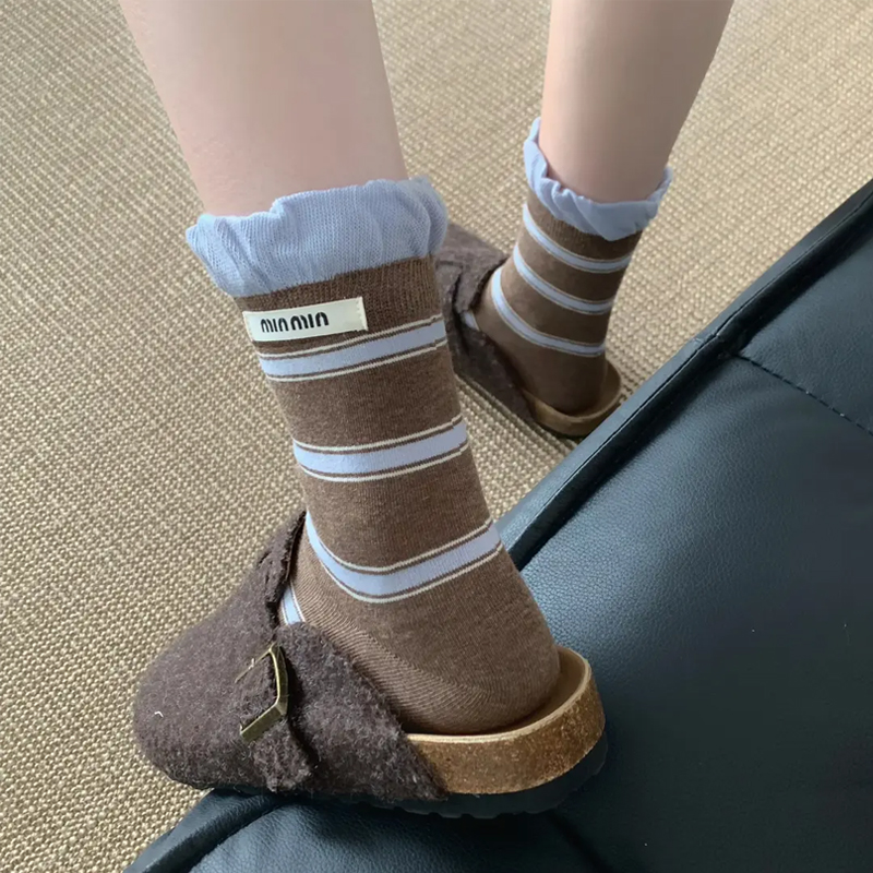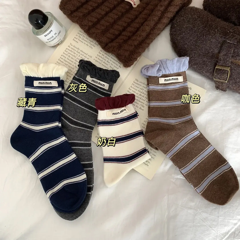 袜子女款2025韩系泡泡口条纹撞色秋冬中筒泡泡口袜子无骨棉袜百搭