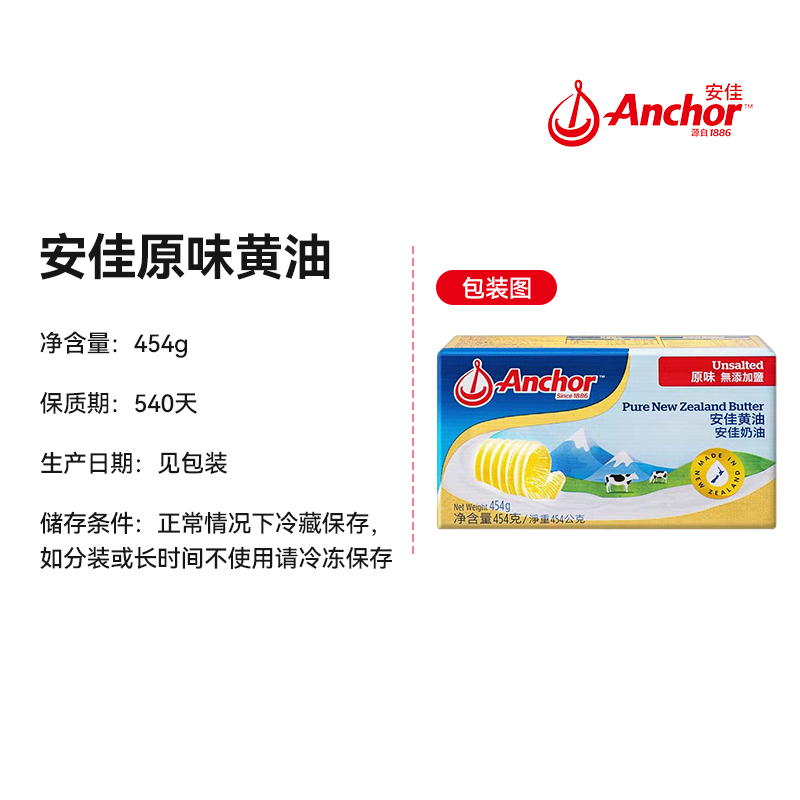 安佳动物黄油原味454g新西兰进口烘焙家用牛排面包饼干雪花酥专用