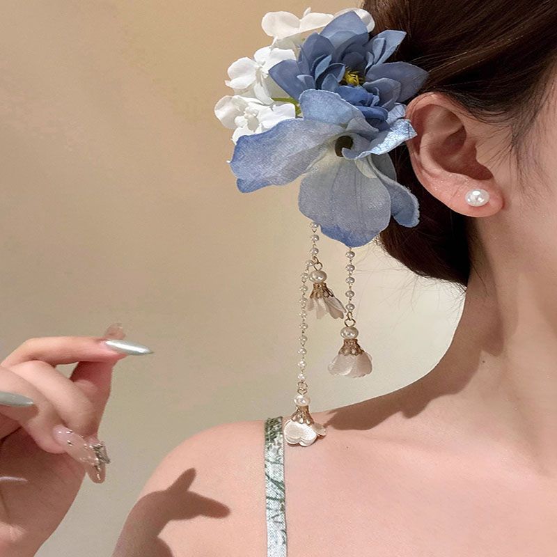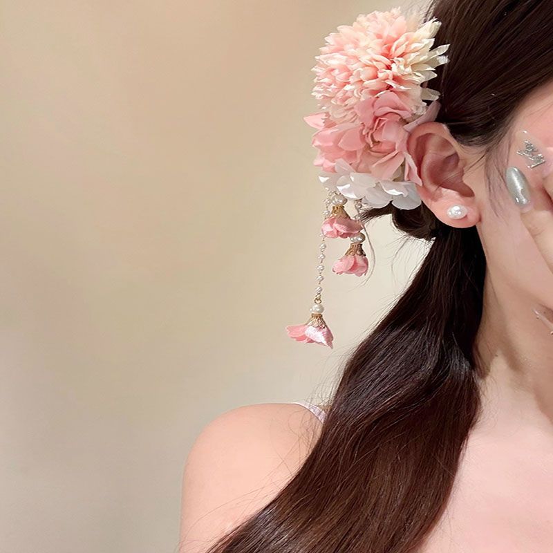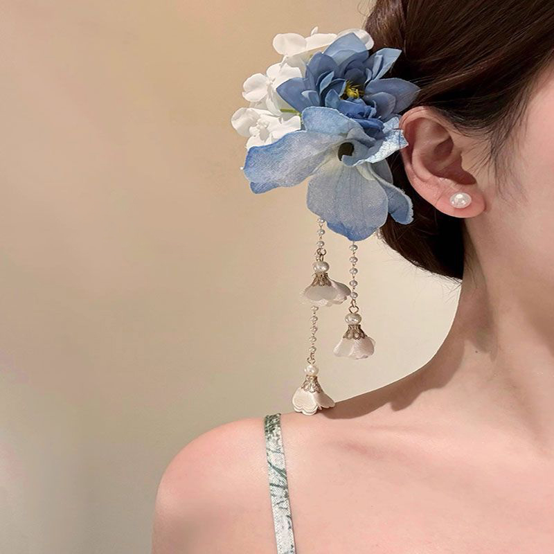 芳华古风蓝色花朵流苏发夹女新中式旗袍侧边夹仙气度假发饰粉色花