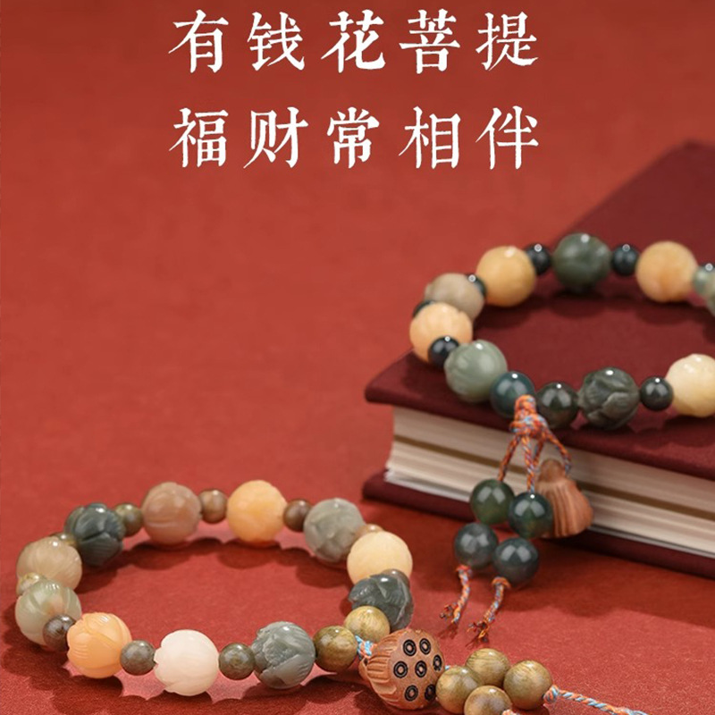 杭州财神莲花菩提根手串雕刻白玉菩提女款平安闺蜜多宝有钱花手链