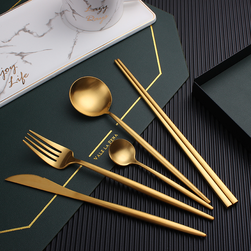 高档304不锈钢刀叉筷套装欧式西餐餐具家用牛排刀叉勺金色咖啡勺
