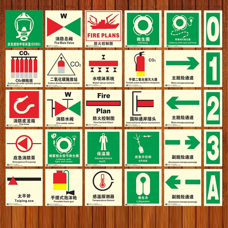 救生圈夜光标识牌IMO国际通用船舶主副脱险通道逃生口救生衣带灯绳风油切断二氧化碳泡沫枪应急消防泵荧光牌