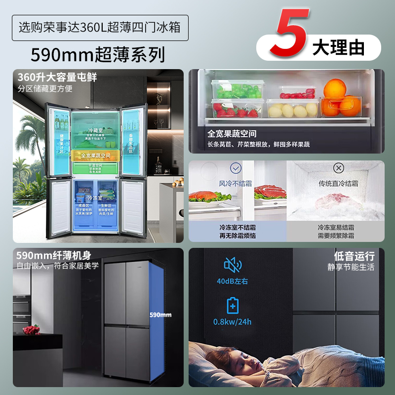 荣事达十字四门对开冰箱风冷无霜一级能效法式家用大容量超薄嵌入