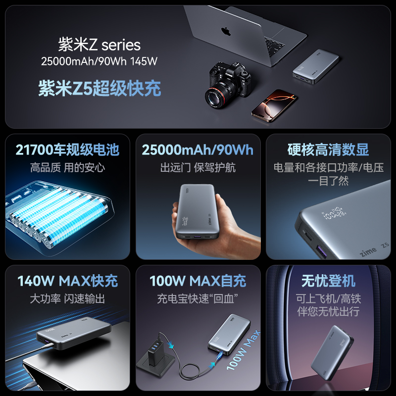 紫米Z5 145W大功率充电宝25000毫安140W超级快充100W适用苹果笔记本电脑无人机3C认证可上飞机大容量移动电源