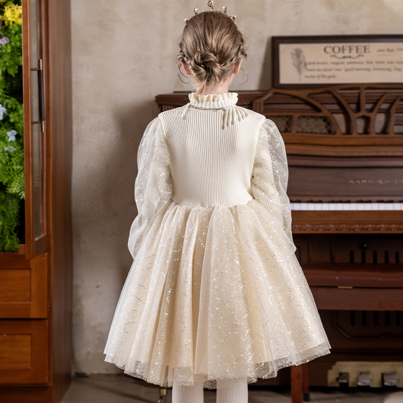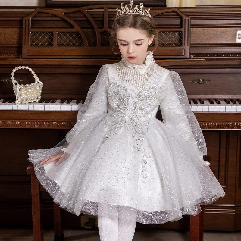 女童富家千金感公主裙秋冬儿童白色艾莎连衣裙小女孩花童婚礼礼服