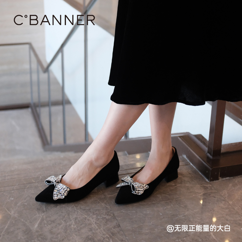 千百度粗跟晚晚鞋春秋气质中跟羊皮浅口尖头单鞋女通勤舒适百搭