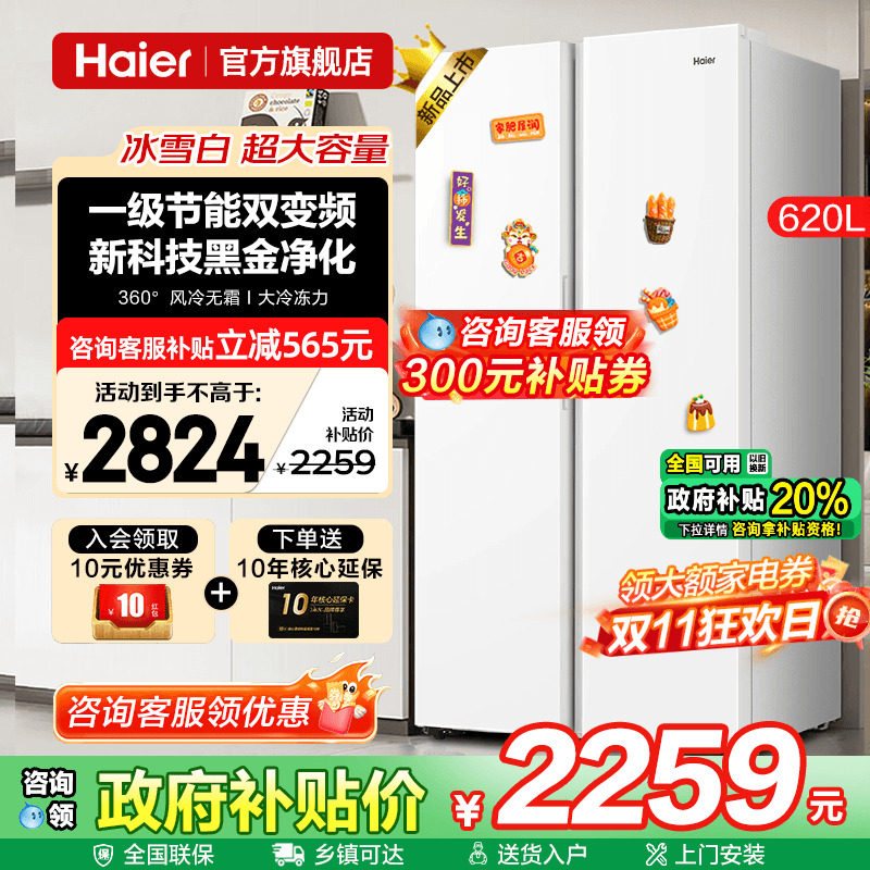 海尔冰箱以旧换新补贴616L双开门大容量冰箱家用一级变频风冷官方