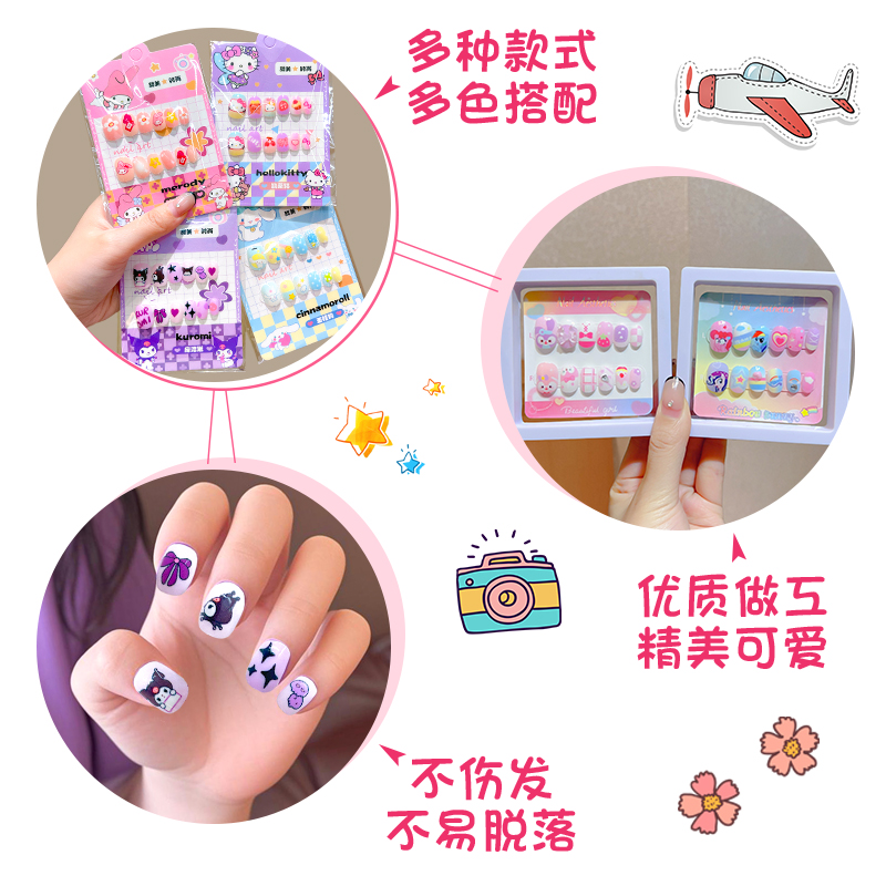 儿童穿戴甲甜美可爱三丽鸥系列指甲贴片女童宝宝萌趣美甲软甲贴果冻胶可拆卸自粘穿戴甲片盒装小女孩玩具礼物