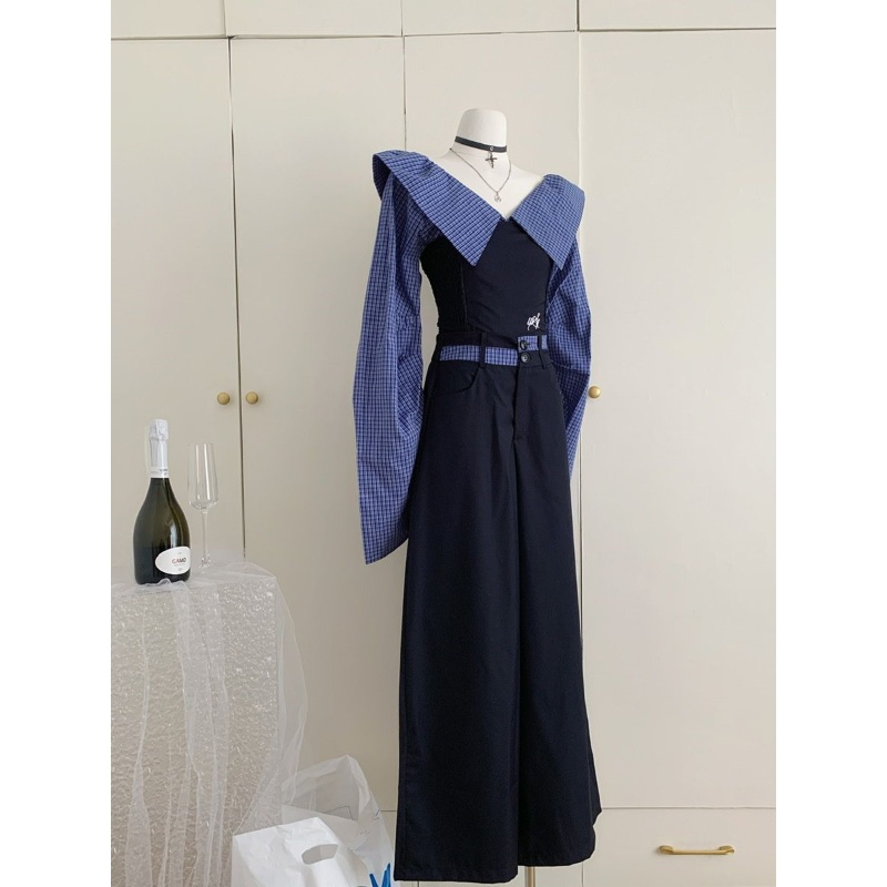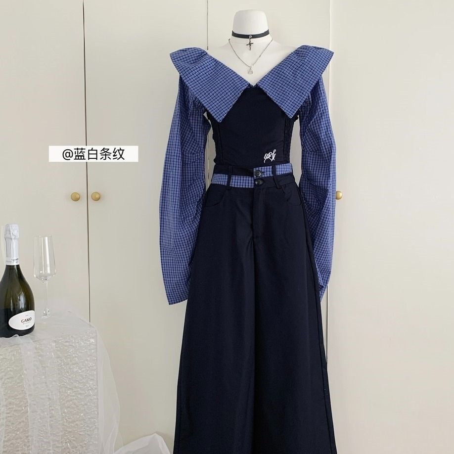 设计感一字肩条纹拼接衬衫上衣女春季高腰阔腿裤两件套大码气质潮