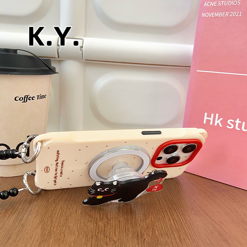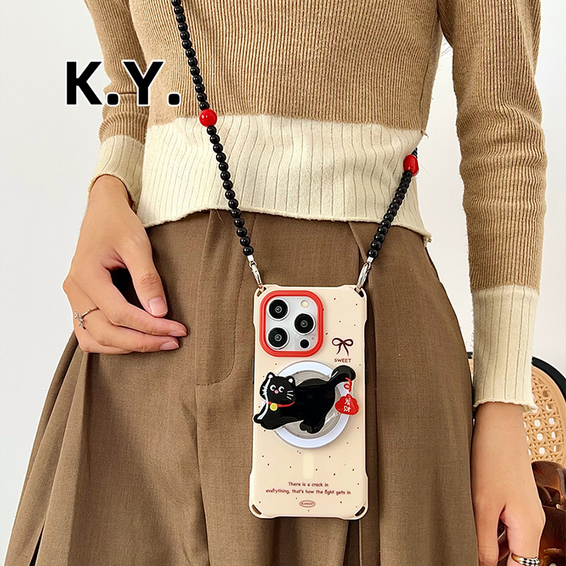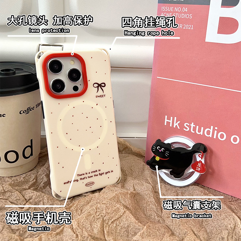 发财猫咪磁吸支架手机壳带挂绳适用于苹果16PROMAX华为mate60/70小米15手腕斜挎FINDX8四角开孔防摔保护套