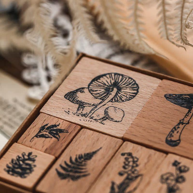 手作复古木质印章套组 星月植物图鉴月球星球蘑菇学生用数字字母符号