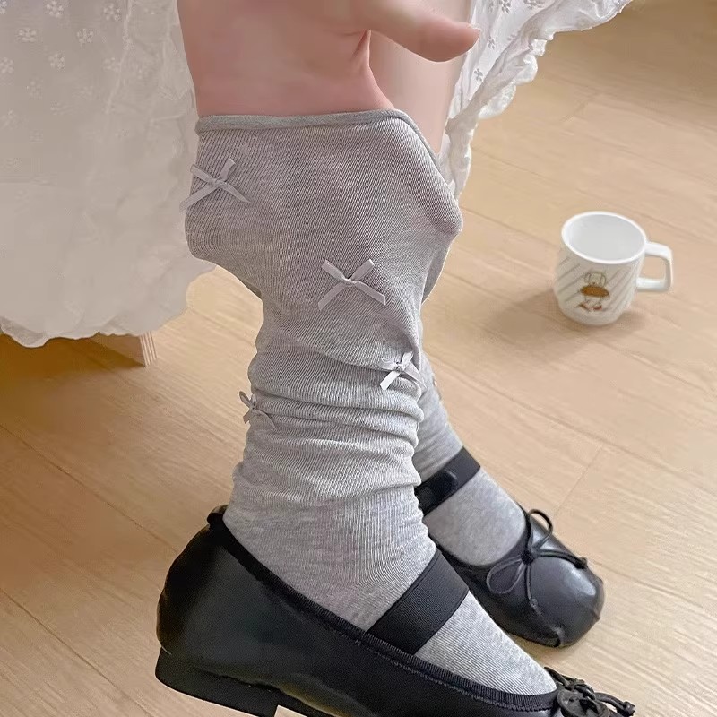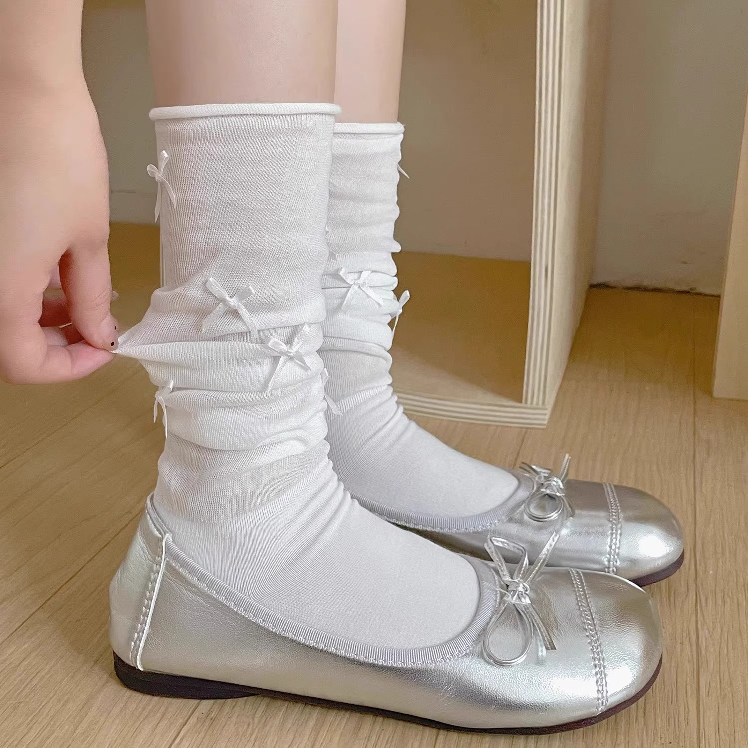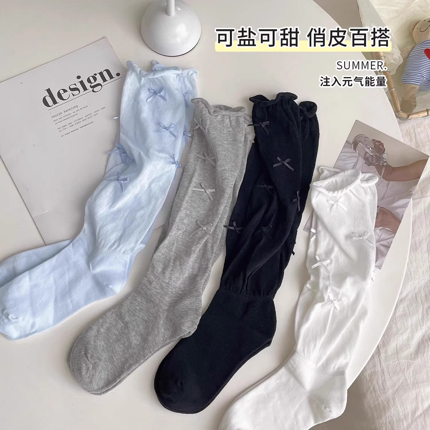 日系蝴蝶结堆堆袜子女长袜春夏季薄款长筒袜jk芭蕾风白色小腿女袜