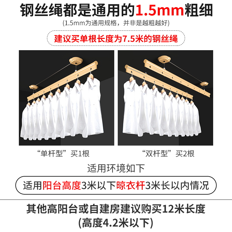 304不锈钢钢丝绳遥控电动升降晾衣架316室内晾衣杆更换配件晒衣绳