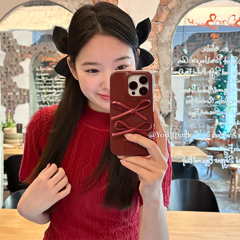 由里公园ins小众秋冬新年红色皮质蝴蝶结15适用16pro苹果16ProMax手机壳iPhone16全包14少女14Promax保护套韩