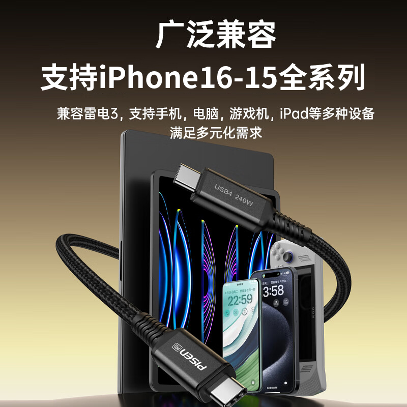 品胜0.3米全功能雷电4数据线ctoc公对公双头USB4短线适用苹果华为小米三星移动硬盘数据传输充电宝240W快充线