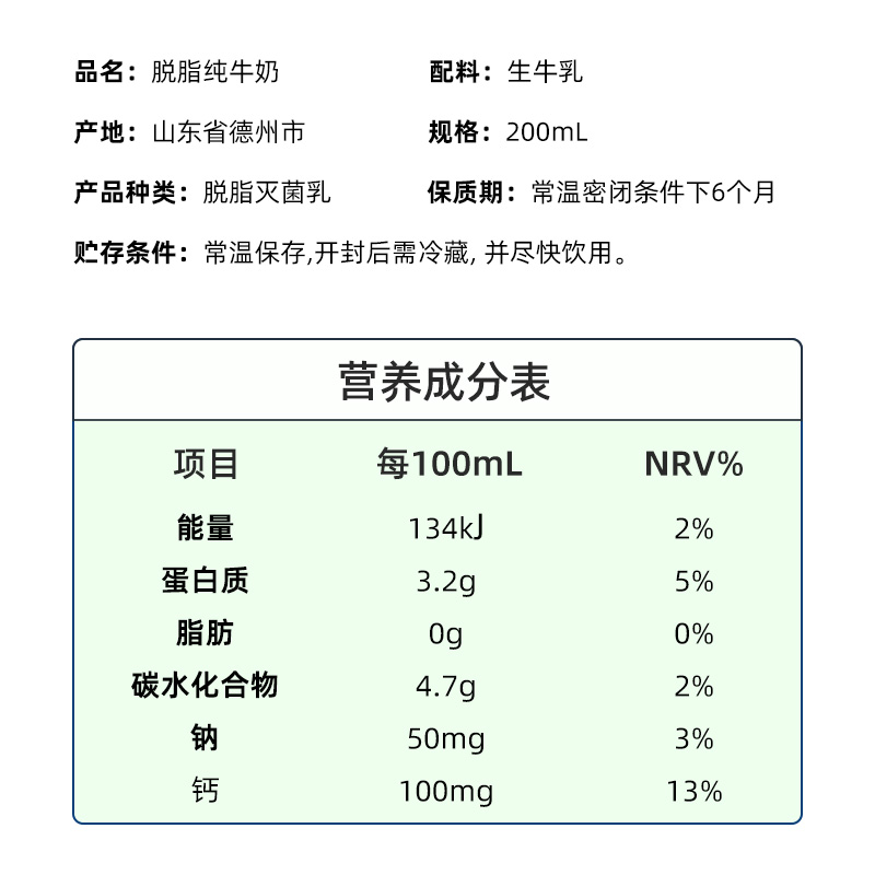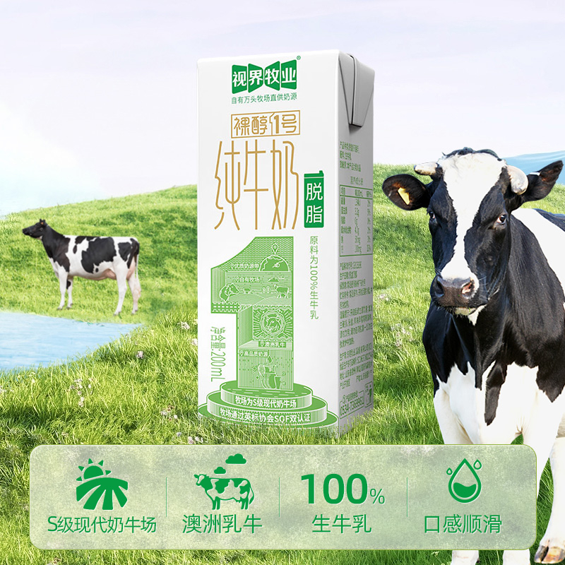 视界牧业脱脂纯牛奶200mlx4盒健身减脂学生营养早餐饮用牧场爆品