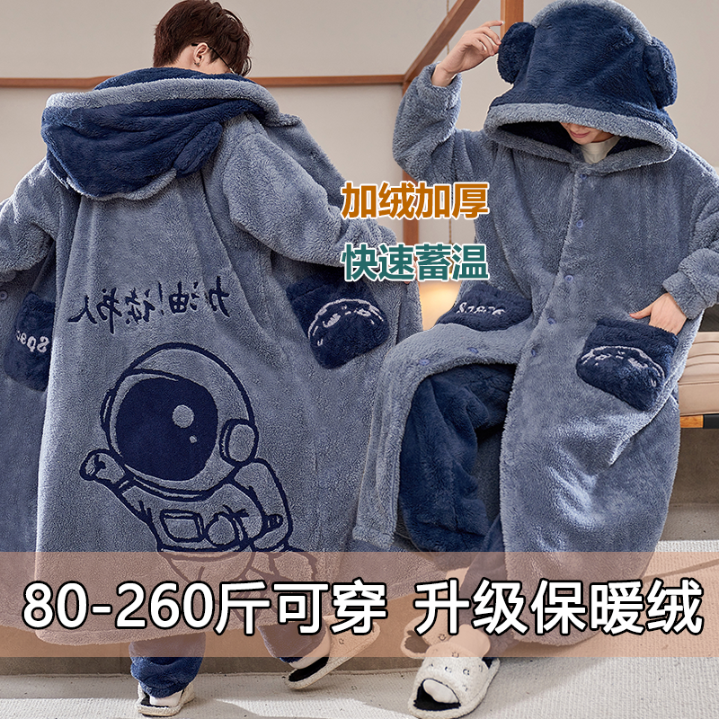 加厚秋冬保暖连帽睡袍男珊瑚绒加绒宽松大码200斤睡衣套装可外穿