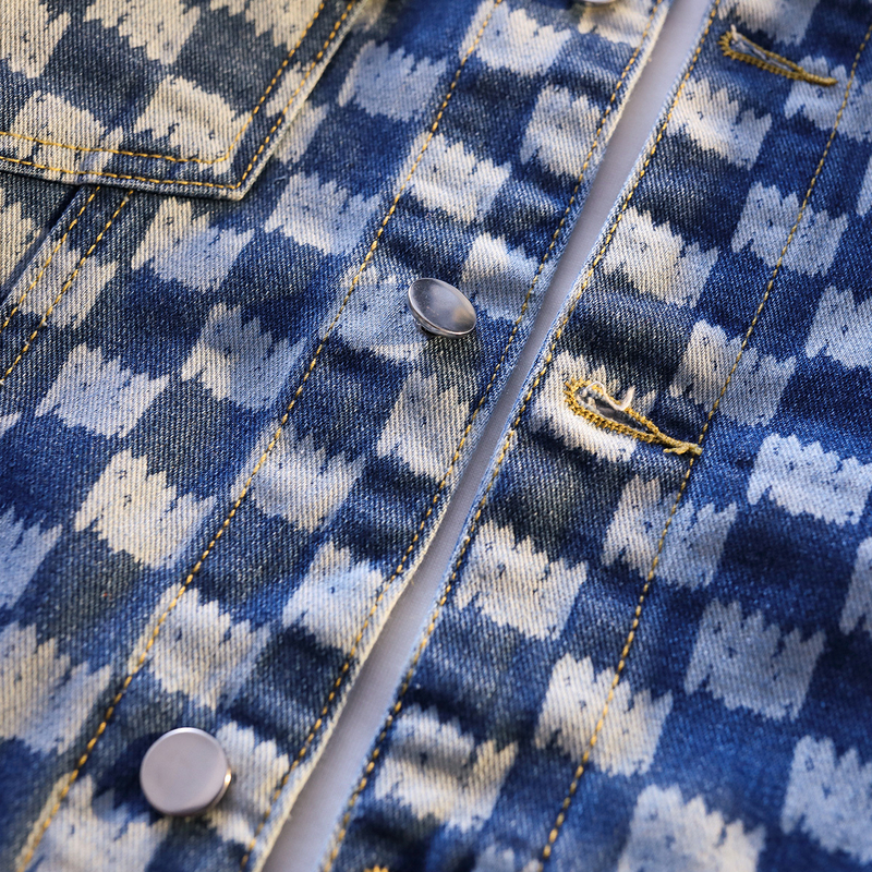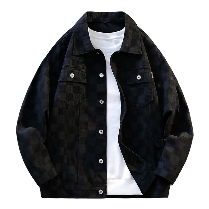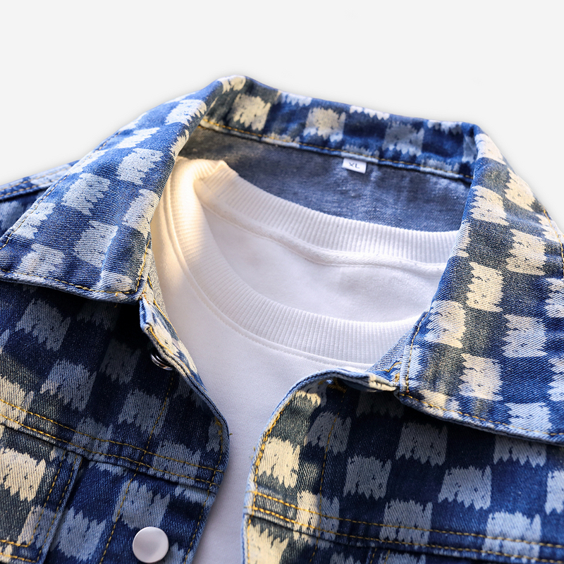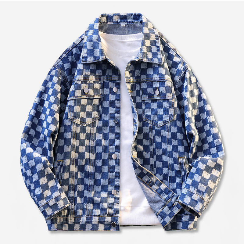 KR真维斯男装2025秋季新款 港风潮流棋盘格印花宽松牛仔外套男