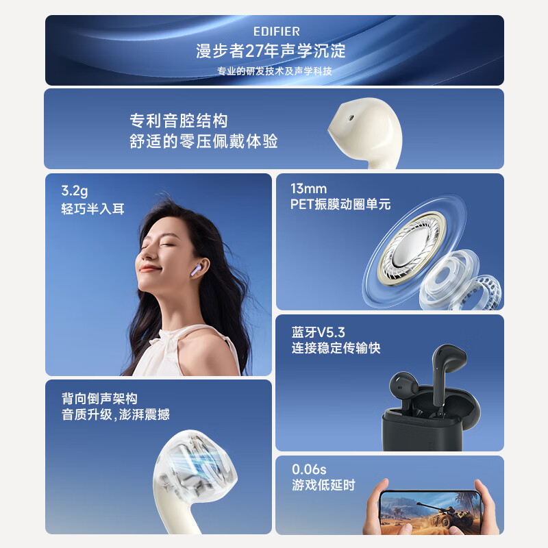 漫步者花再Zero Air蓝牙耳机半入耳蓝牙耳机低延迟长续航蓝牙耳机