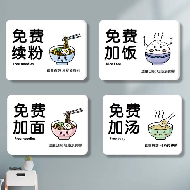 亚克力免费续饭续粉贴牌免费加饭加面加汤提示告知牌餐厅创意墙贴