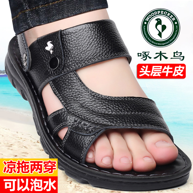 啄木鸟夏季新款凉鞋男真皮开车新款沙滩鞋男士软底防滑两用凉拖鞋