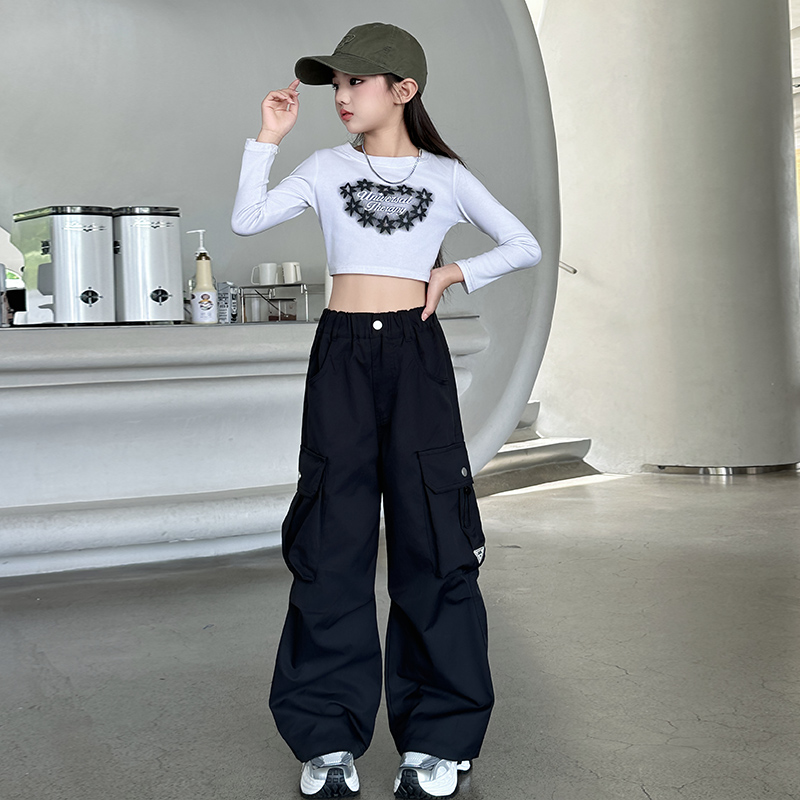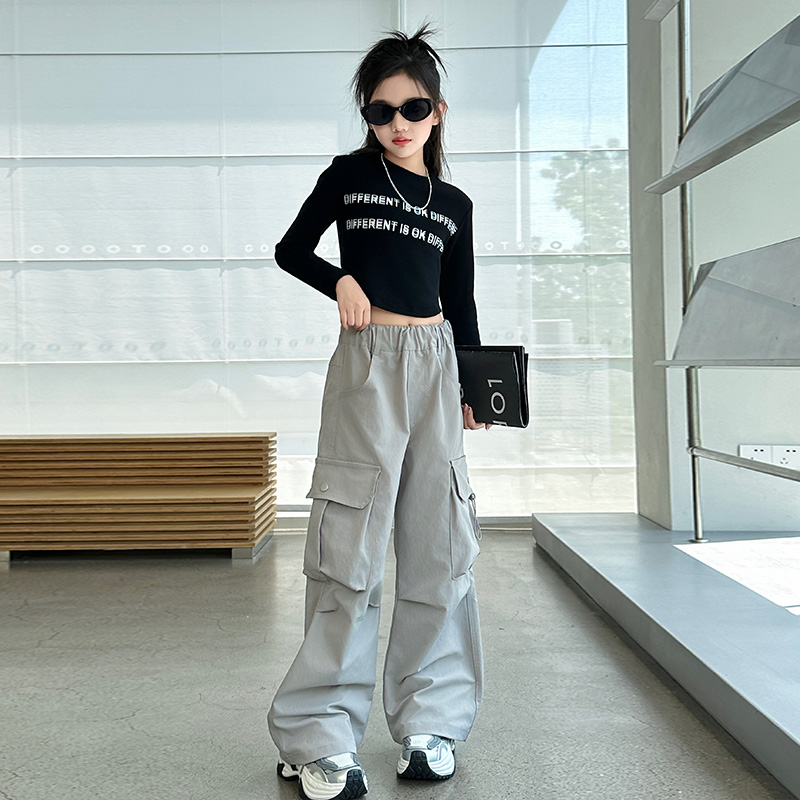 女童秋装美式炸街裤子大童时髦工装裤初中生春秋款洋气高腰阔腿裤