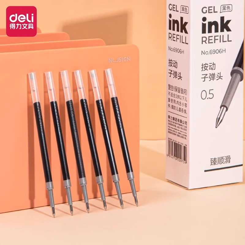 得力中性笔替芯按动笔芯0.5mm子弹头黑色蓝色臻顺滑笔芯红笔芯大容量实惠装按压式笔芯学生考试老师专用6906H