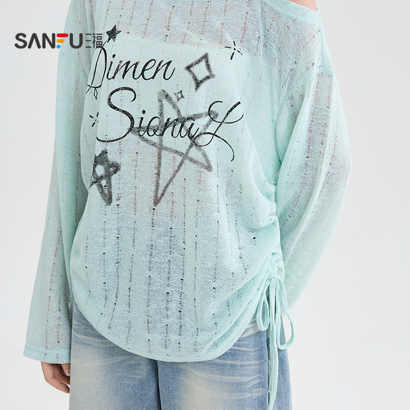 三福长袖上衣2025新款秋季蕾丝斜肩t恤宽松慵懒风罩衫女装508145