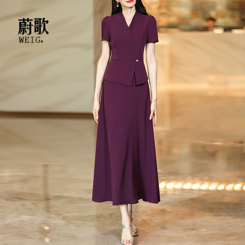 紫红色V领假两件连衣裙夏2025新款高级感气质修身显瘦减龄长裙子