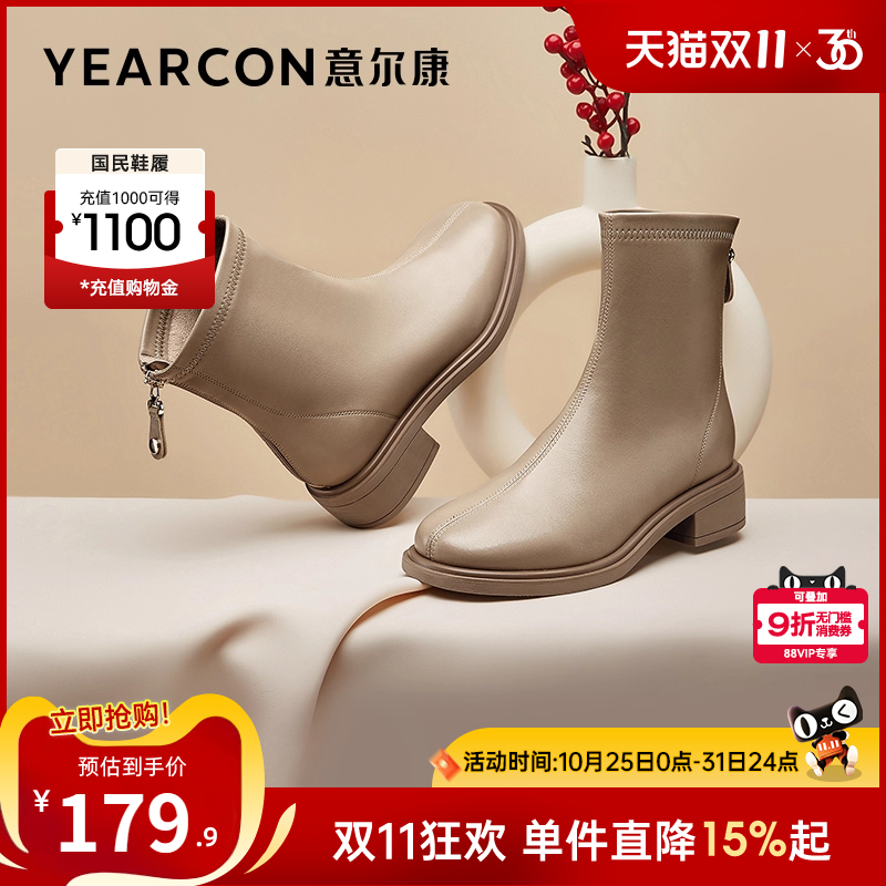 意尔康女鞋冬季休闲加绒短靴粗跟气质英伦显瘦复古及踝靴女士皮鞋
