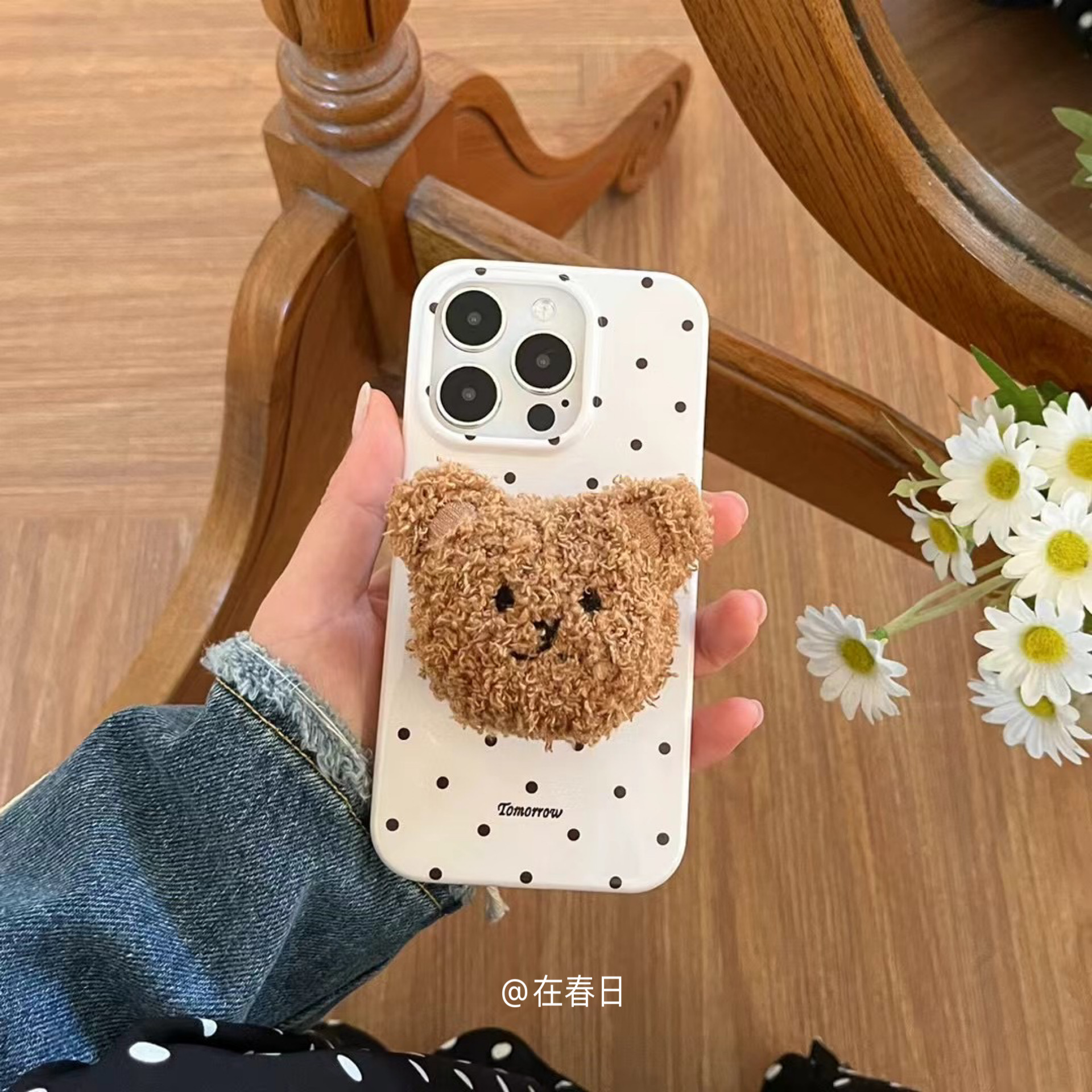 在春日ins毛绒小熊支架波点手机壳15promax/14适用苹果15pro/14promax/13硅胶软壳15秋冬16promax