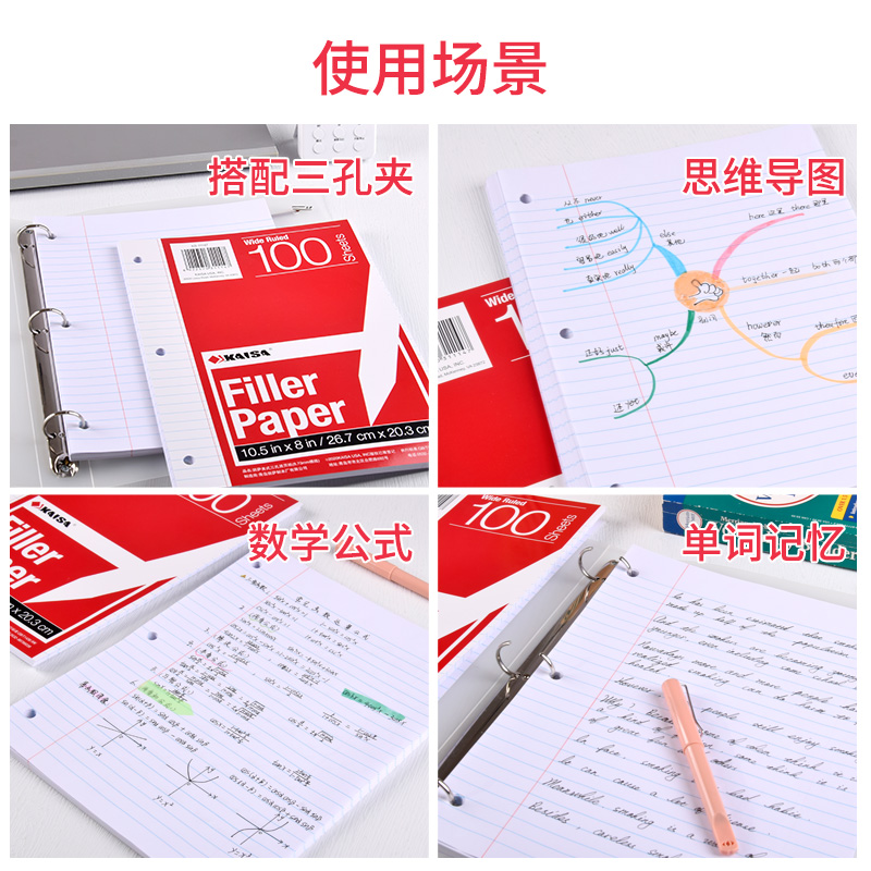 凯萨美式三孔活页纸A4加厚大容量活页替芯横线方格考研学生笔记本