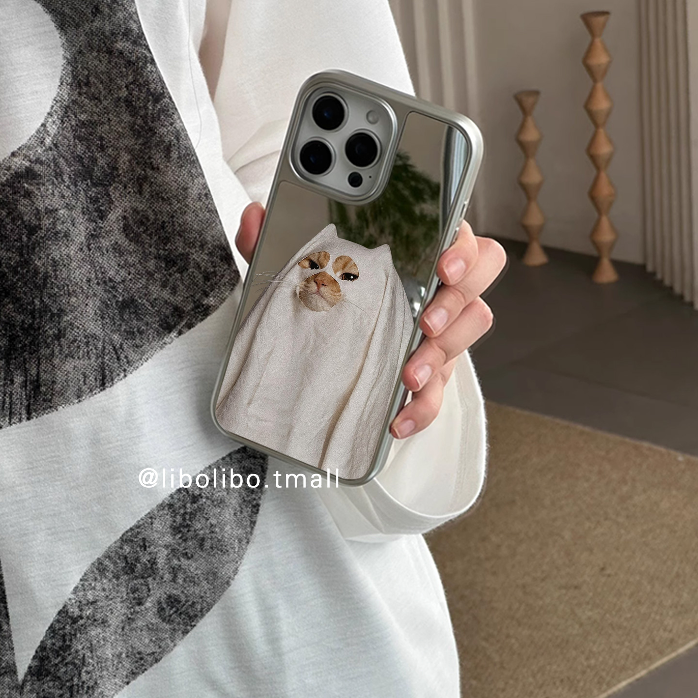 哩卜哩卜萌趣幽灵猫咪用iPhone16pro手机壳苹果磁吸15promax镜面13/14pro镜子12promax时尚16pro电镀银11