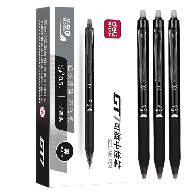 得力GT7按动可擦中性笔学生用热敏可擦晶蓝中性笔黑色0.5子弹头