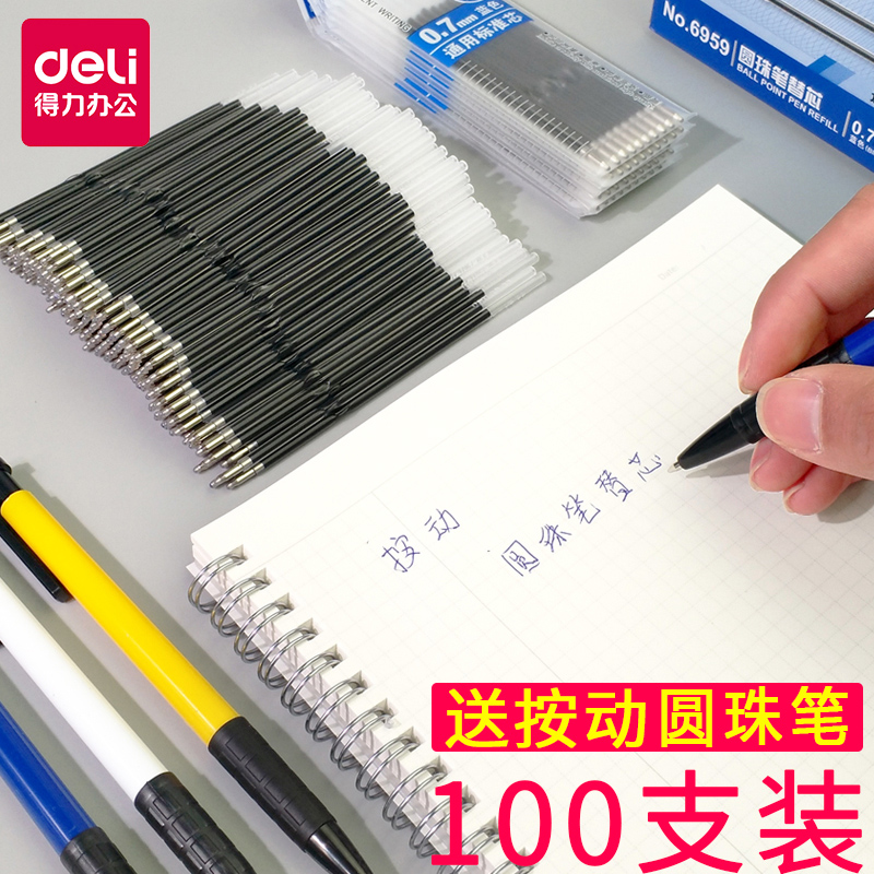100支得力蓝色按动型圆珠笔替芯通用圆珠笔芯0.7mm蓝色学生考研考试教师批卷红笔芯按压黑色圆珠笔专用笔芯