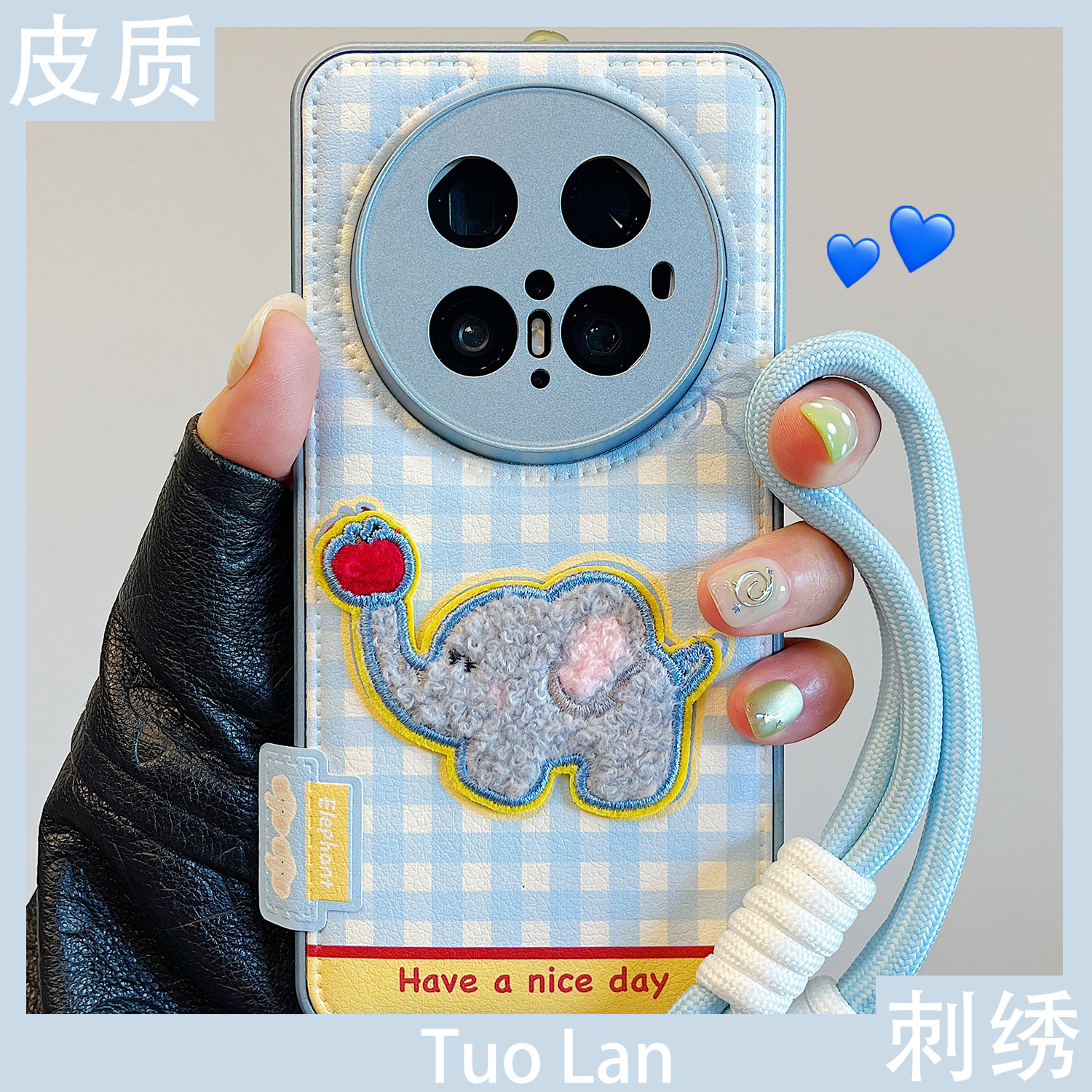 拓岚 适用华为pura70pro+新款手机壳Pura80ultra韩风蓝白格纹卡通立体刺绣大象mate70/60/50/40pro挂绳皮质女