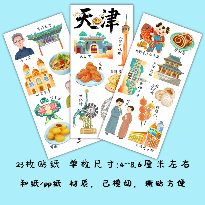 天津旅游手帐贴纸城市旅行家乡美食景点非遗人文手抄报识字贴画