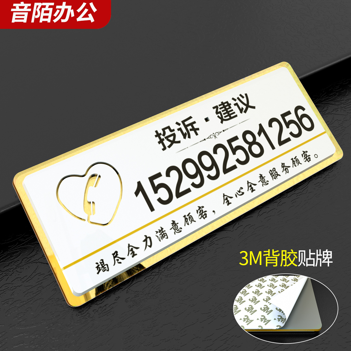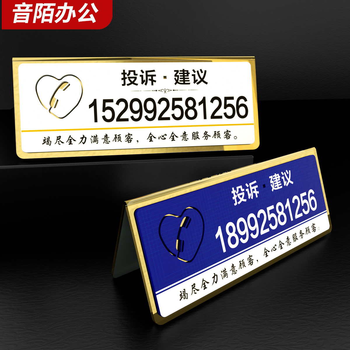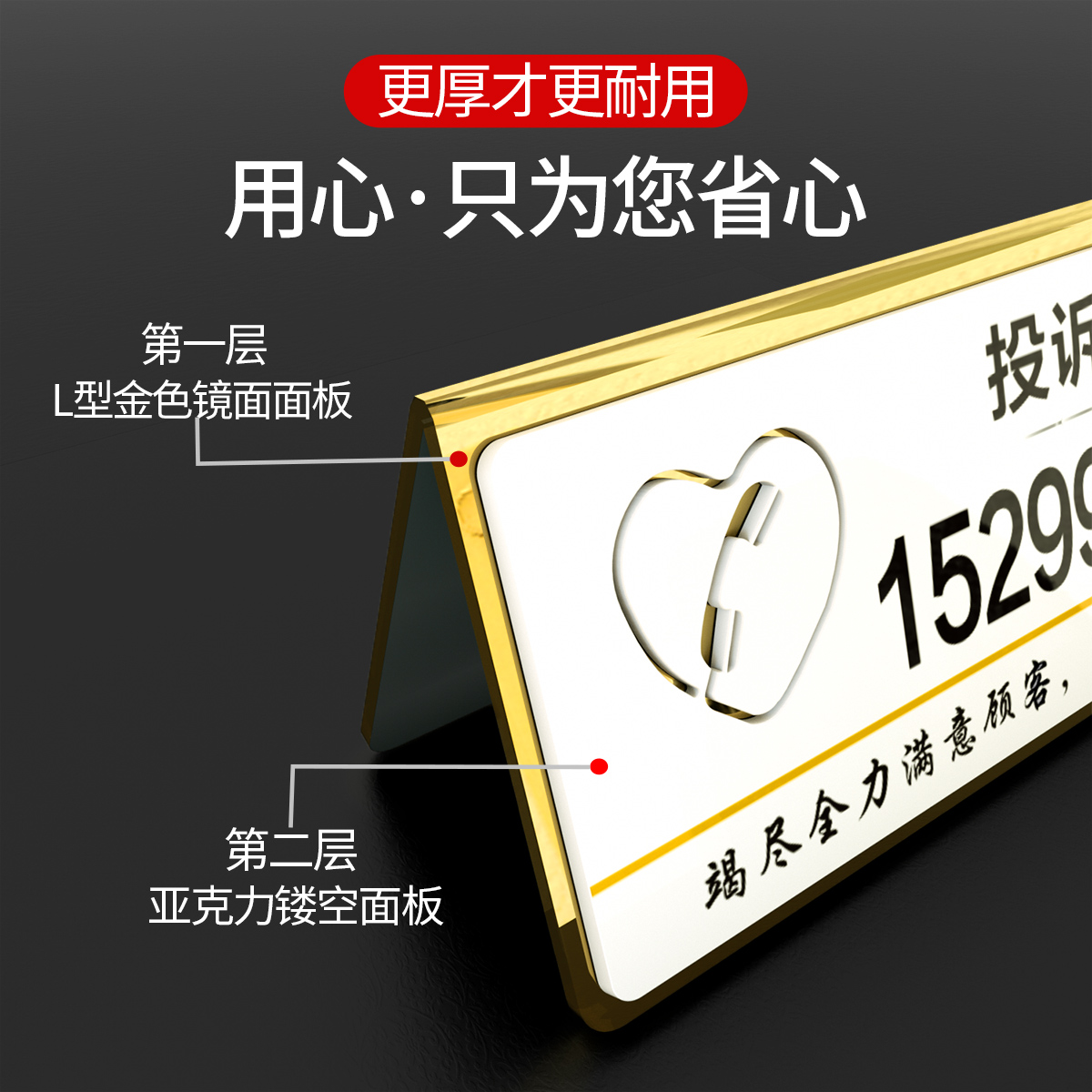 亚克力金色镜面镂空投诉建议电话牌酒店前台值班加盟联系电话举报热线服务监督号码V型双面台牌定制