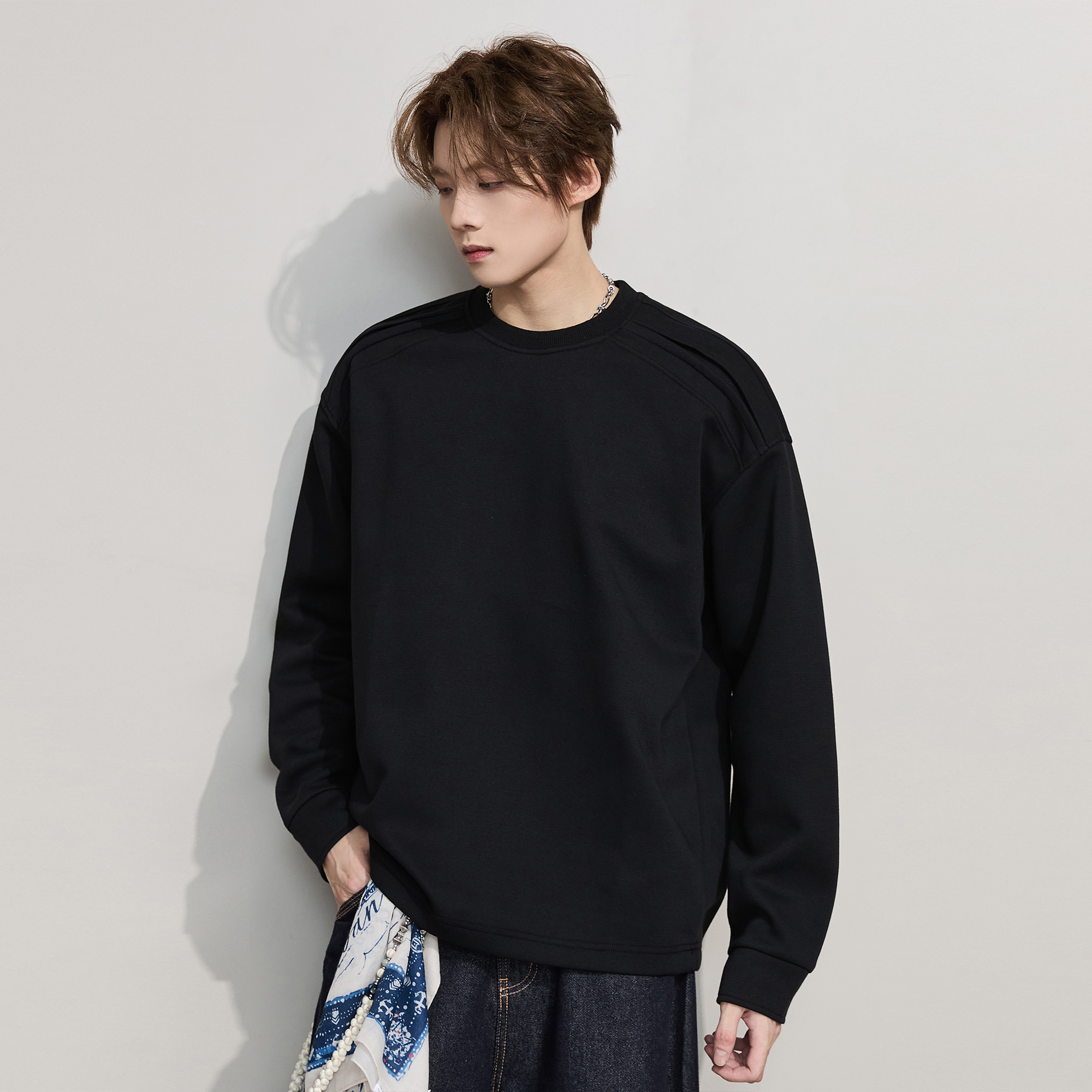 ALLIN 黑色重磅套头卫衣男秋冬廓形圆领大码上衣情侣宽松百搭外套